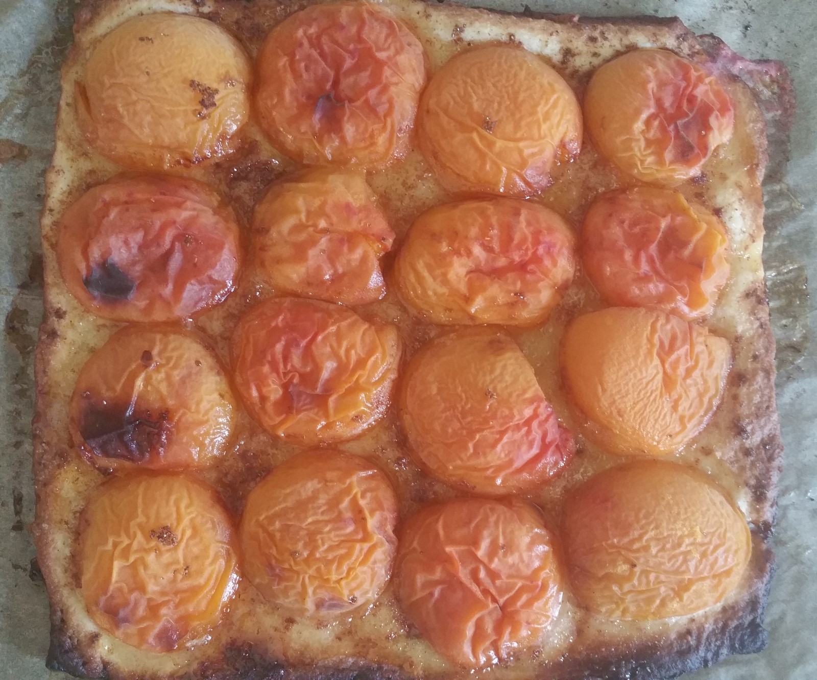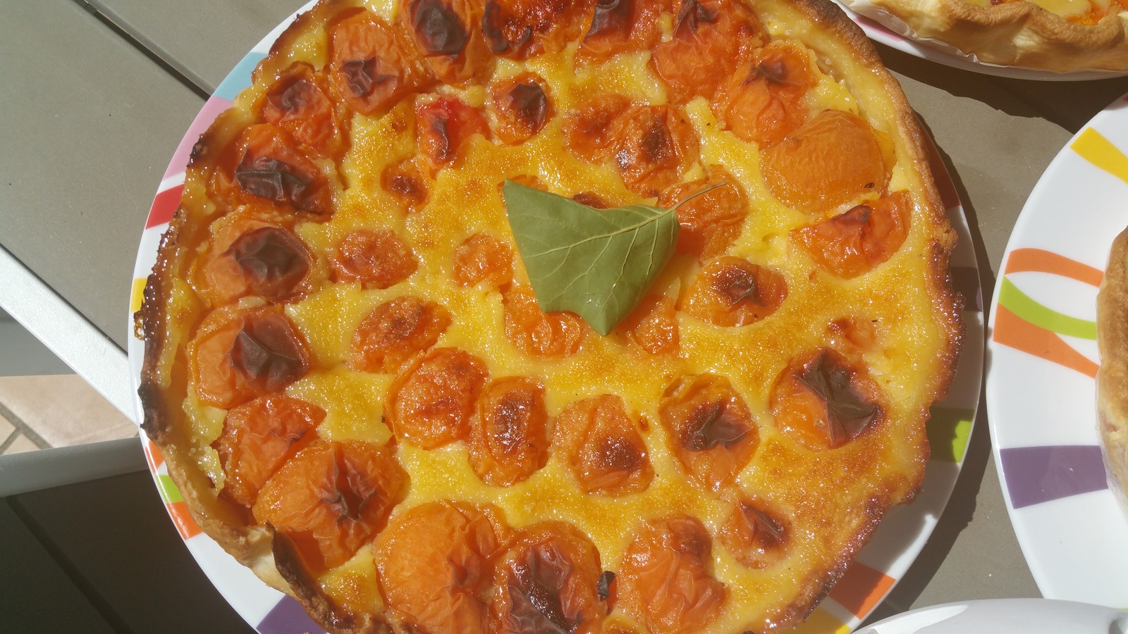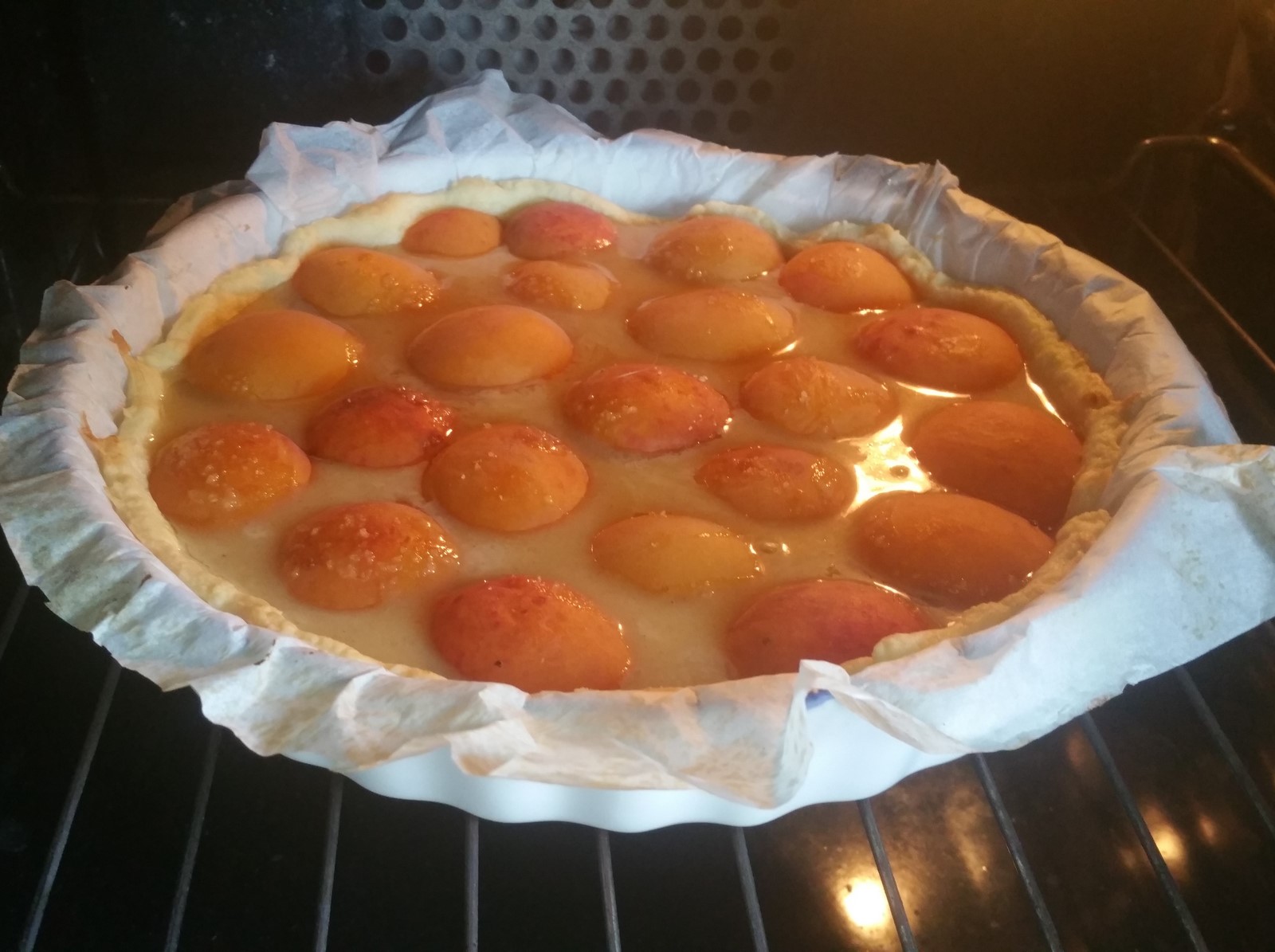 Haal de taart weer uit de oven en giet het bovenstaande mengsel over de taart totdat de ‘kontjes’ van de abrikozen nog net boven dit mengsel uitkomen