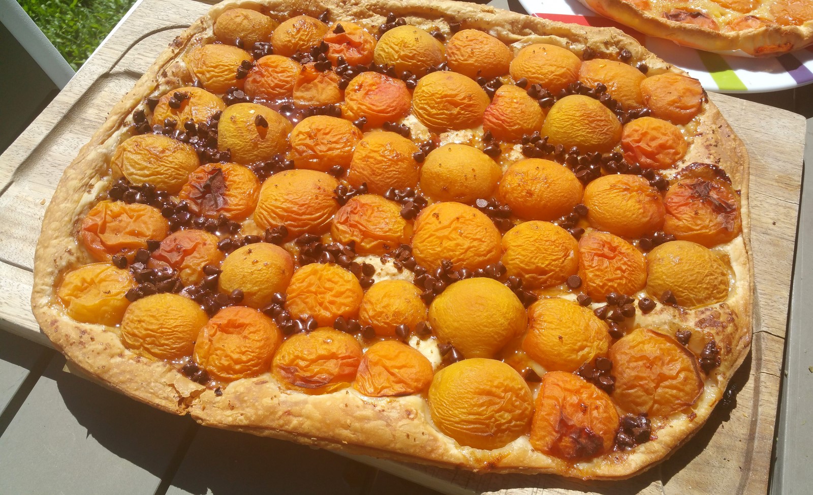 Leg de in 2-en gesneden abrikozen over het hele deeg en strooi kleine stukjes chocola hieroverheen.