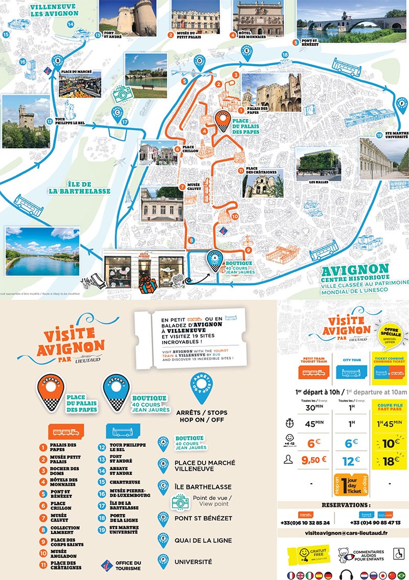 Hierin vind je niet alleen alle informatie over bezienswaardigheden, maar ook 3 stadswandelingen. Mijn tip: loop in ieder geval de route 'La balade des Papes'. Je komt dan in het hart van Avignon terecht met het Paleis, de beroemde 'Pont d'Avignon' en het park 'Rocher des Doms'. Je kunt dit overigens ook met het treintje doen, zie de informatie hieronder.
