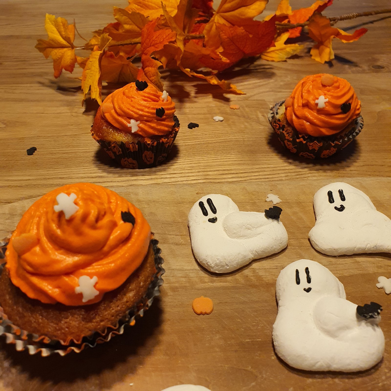 Ok, op de foto zie je een cupcake-versie van deze herfstcake met walnotenolie en sinaasappel, maar je kunt hem natuurlijk ook in een gewone cake-vorm bakken. Dit jaar heb ik deze cake-jes gemaakt voor Halloween. Niet zo moeilijk met wat kleurstof door de slagroom en speciale Halloween versiersels. Je kunt deze cake echter het hele jaar door maken en mijn kinderen zijn er dol op.