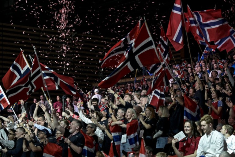De sfeer in de zaal en op de tribunes is fantastisch, alsof je bij de finale van de Champions League zit. Grote groepen mensen zwaaien met vlaggen, hebben hun gezichten beschilderd en moedigen zeer luidruchtig alle internationale deelnemers aan.