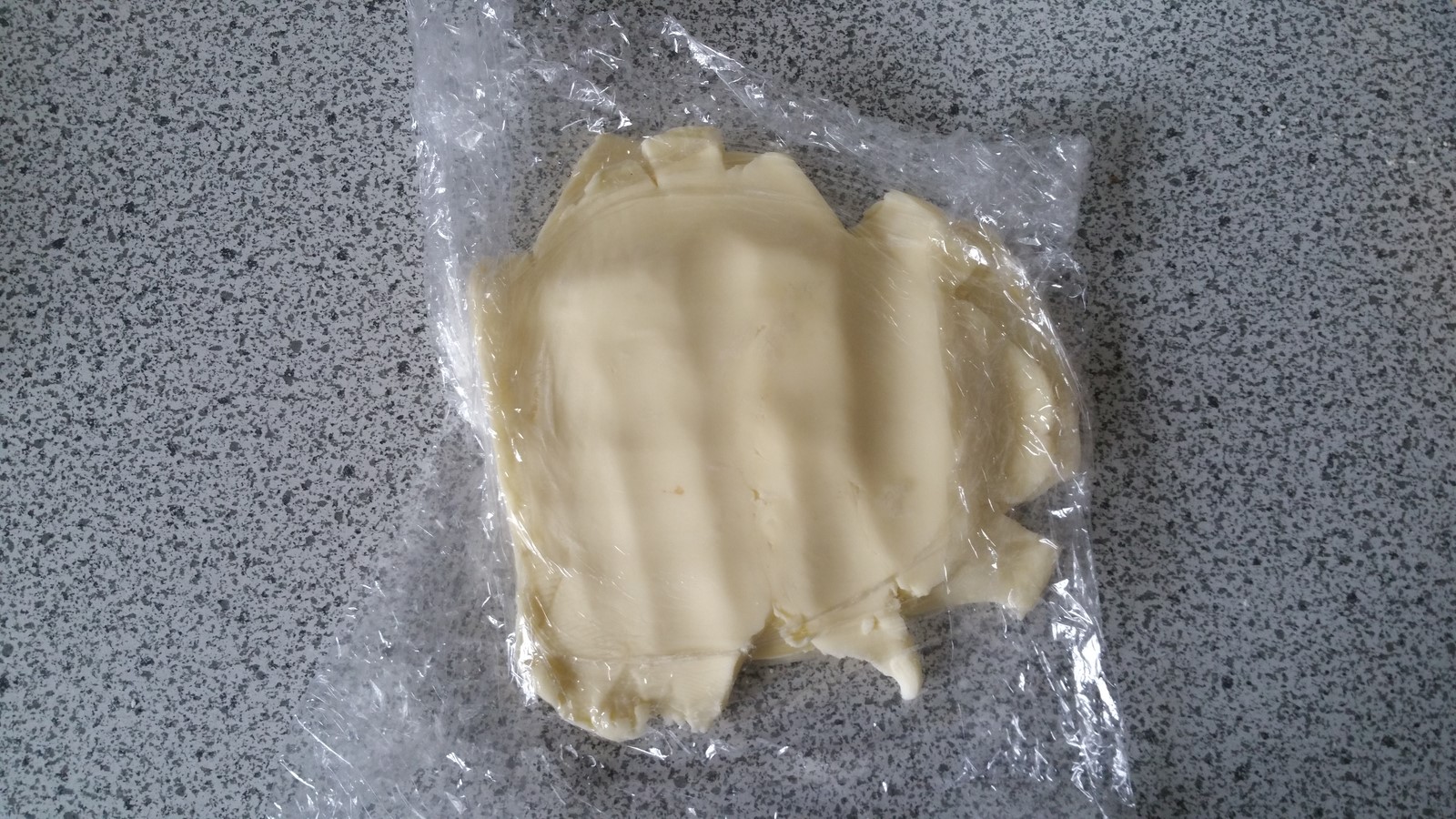 5. Sla nu deze boter, met een deegroller, plat en probeer door hem bij de ‘vouwen’ er zoveel mogelijk een vierkante vorm aan te geven. Leg ook de boter weer even in de koelkast, zodat hij weer goed koud wordt.