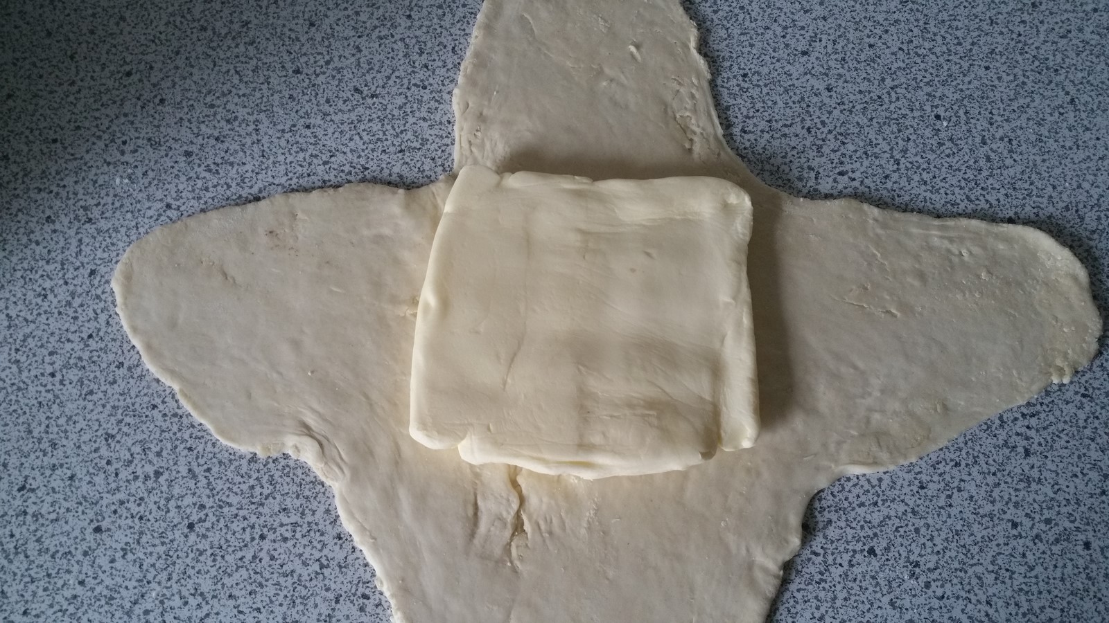 7. In het midden van deze bloem leg je nu de boter en je slaat de vier uiteinden over de plak boter heen.