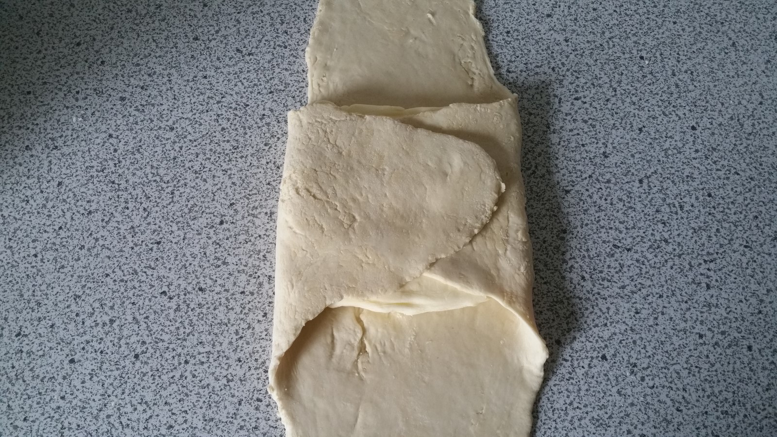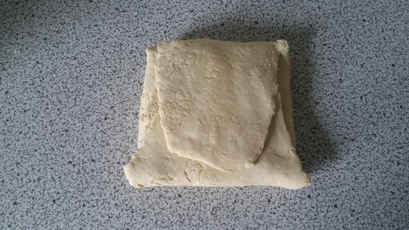 9. Wanneer dit het geval is leg je de lap deeg in de lengte voor je en begin je met vouwen : je pakt de rechterkant van de lap en vouwt deze naar binnen toe op ongeveer 1/3 van het deeg. Dan pak je de linkerkant en vouw je deze zo ver dat de randen tegen elkaar aan liggen. Hierna pak je nogmaals de linkerkant en vouw je deze helemaal naar de andere kant. (als een gesloten boek) Leg het deeg nu in de koelkast zodat de boter weer koud kan worden. Bravo !!! Dit was deel 1 !