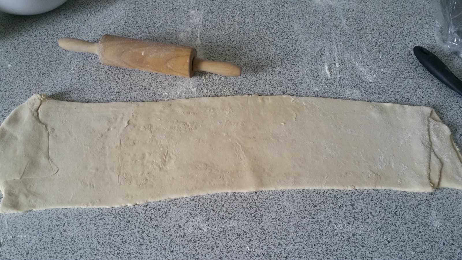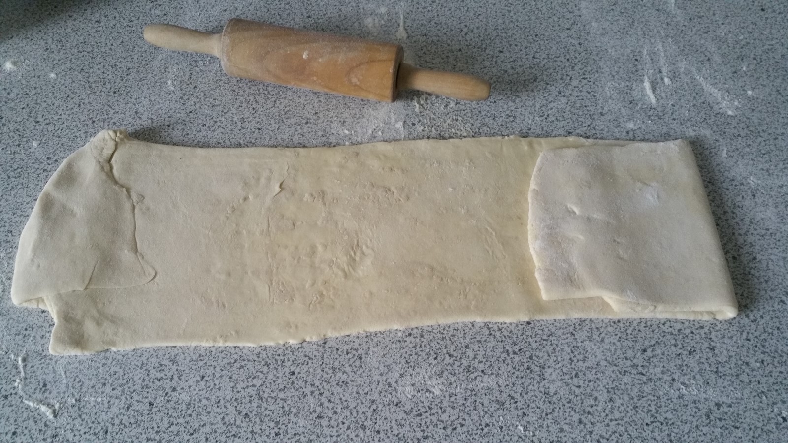 8. Duw een beetje met de deegroller op het pakketje om hem in te laten zakken en rol het deeg nu voor je uit. Er moet een lap deeg onstaan waarbij de lengte ongeveer 3x de breedte is.