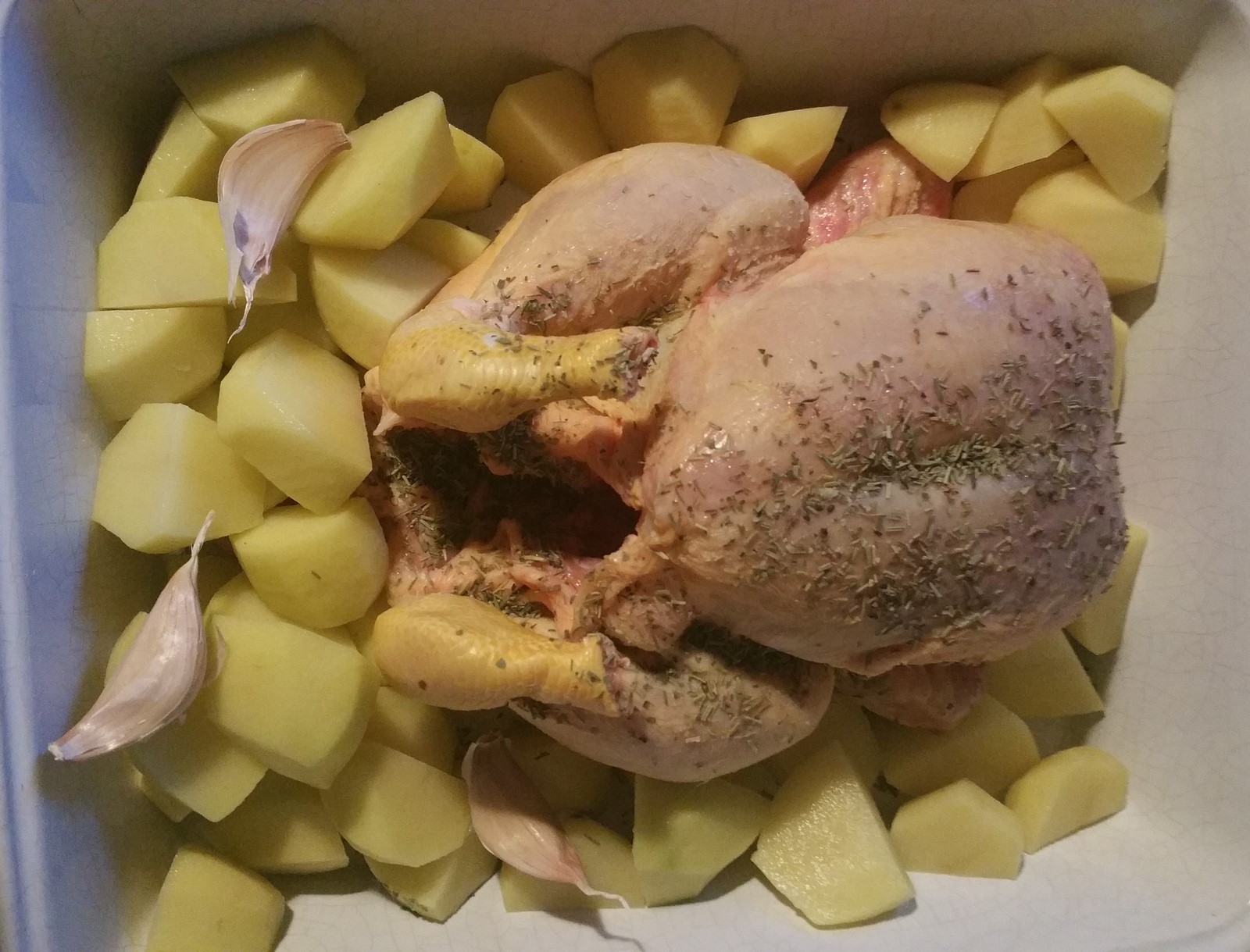Leg ook wat tenen knoflook om de kip heen, die poffen dan lekker mee