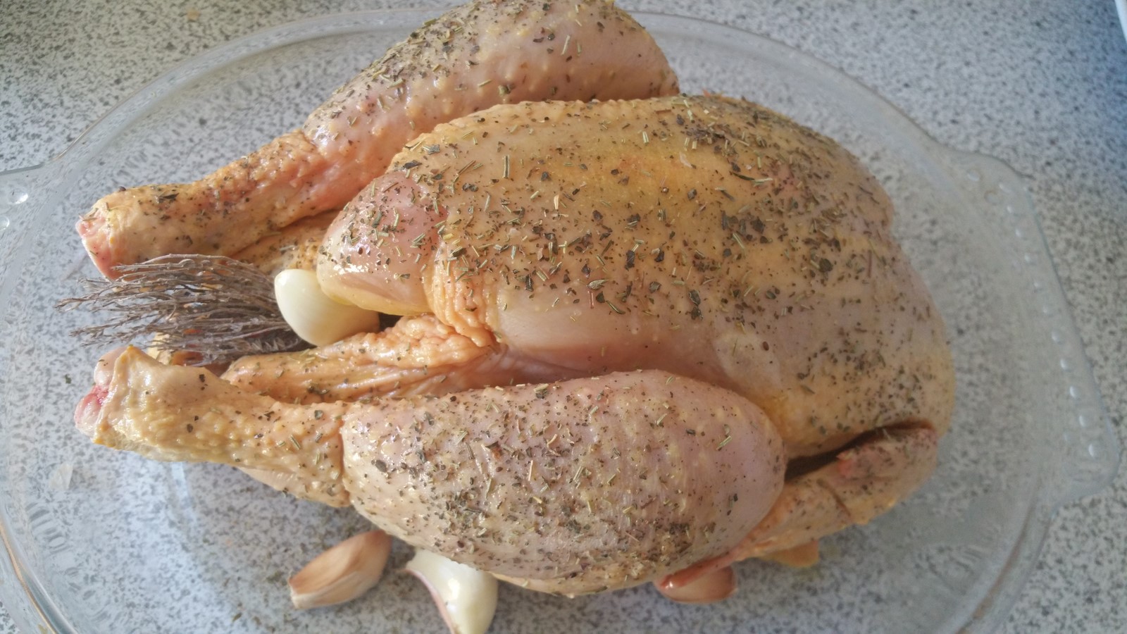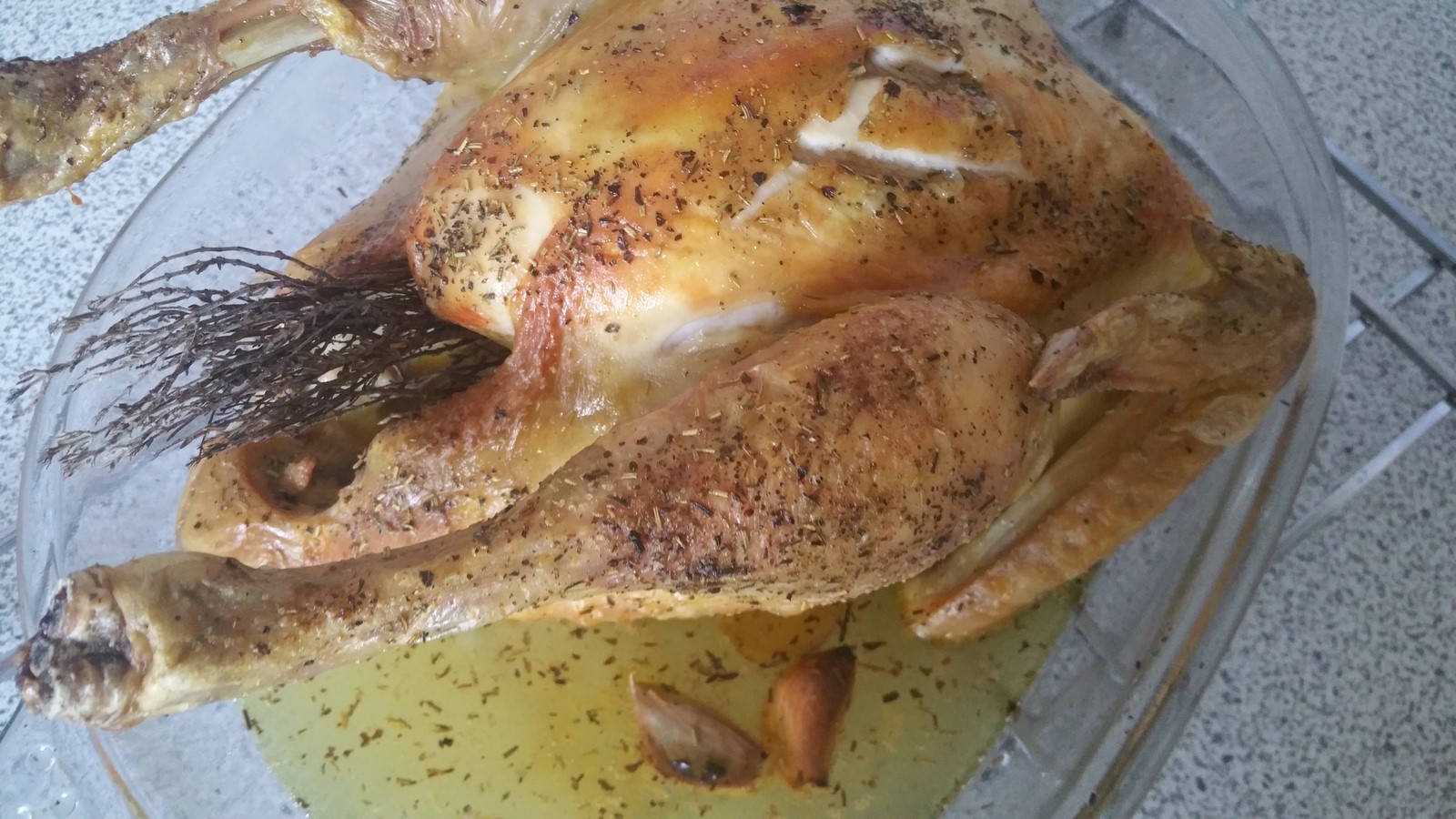 Wanneer de kip de oven ingaat laat ik persoonlijk de oven eerst altijd zo’n 20 minuten op 210 °C – 230°C staan, daarna haal ik de schaal uit de oven en doe er een flinke scheut heet water bij die ik over de hele kip heen giet. Let op: nooit koud water erbij, dan knapt de schaal ! Dit is mij 1 keer gebeurd, geloof me, het gebeurt me geen tweede keer…