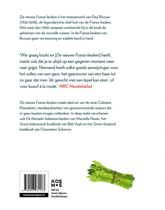 Het kookboek 'De Nieuwe Franse Keuken' van Paul Bocuse staat vol met recepten van deze bekende Franse chef. Paul Bocuse is helaas overleden in 2018, maar zijn recepten leven voort in zijn sterrenrestaurants.Zijn bekende zwarte truffel soep, bedacht voor president Valéry Giscard-d'Estaing, is een ware klassieker en de Bocuse d'Or, een zeer prestigieuse kookwedstrijd, is door hem opgezet. Zoals het NRC Handelsblad zei: 'Er is geen beter raadgever dan Paul Bocuse'.