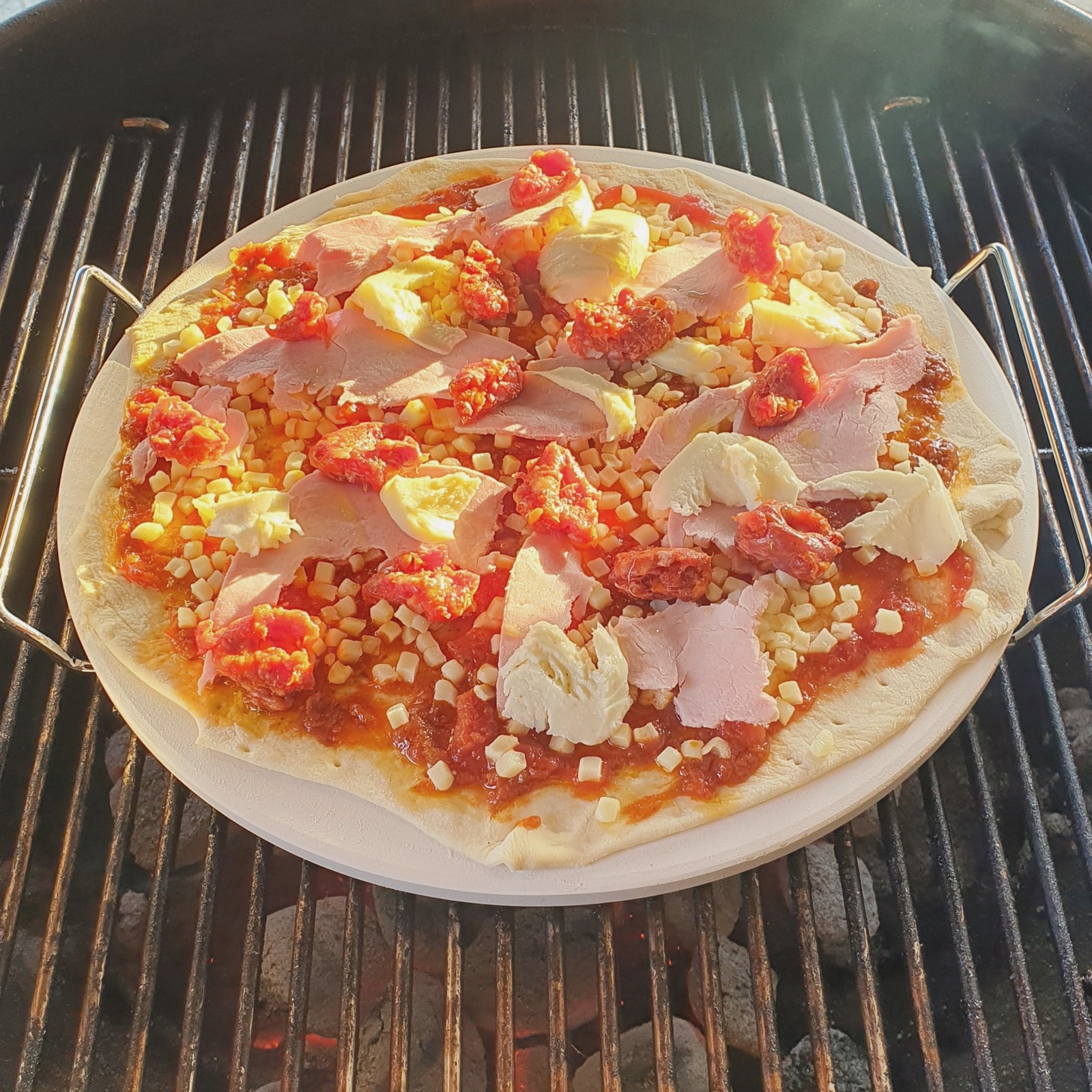 Zelf maak ik regelmatig pizza op de barbecue, dit geeft een heerlijke rooksmaak en de pizza krijgt een hele krokante bodem. Ik doe dit met behulp van een pizzasteen. Deze kun je trouwens in de shop van Renie's Franse Keuken vinden door hier te klikken.