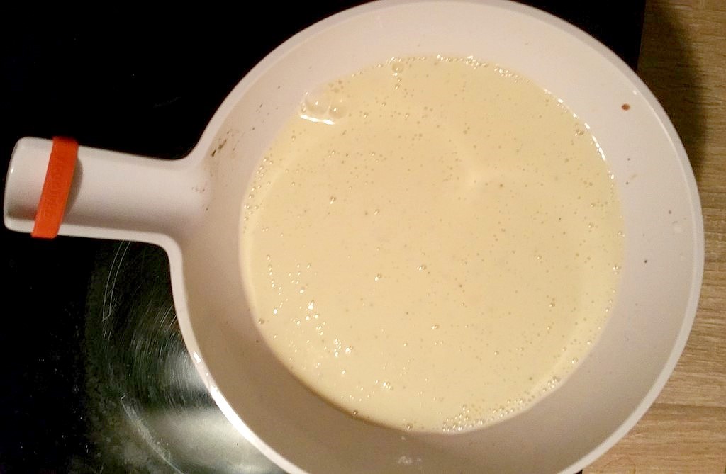 Doe de crème fraîche en de eieren in een kom en mix deze met een vork of een garde.
