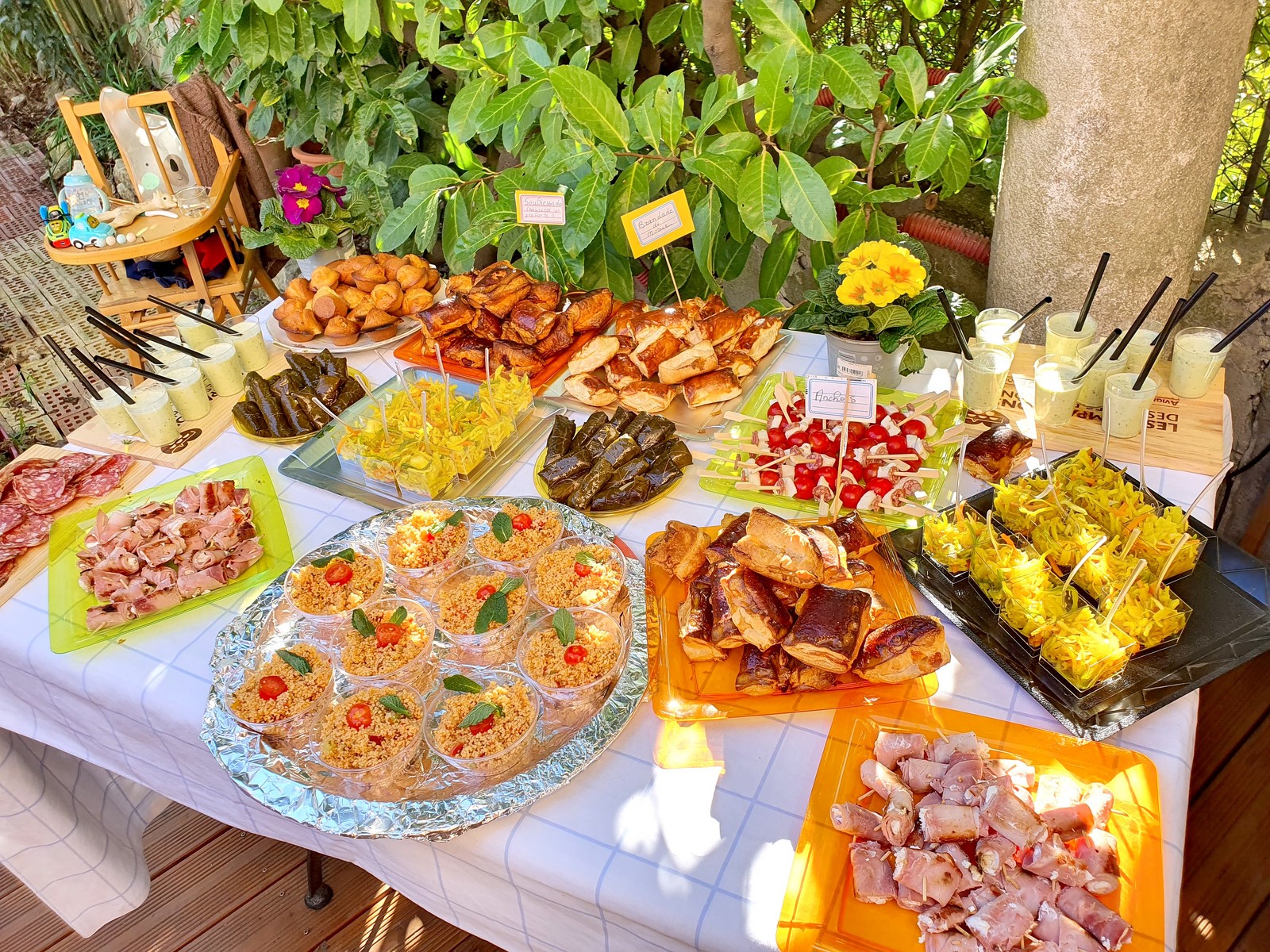 Voor het hartige gedeelte moet je denken aan verschillende soorten quiches, pasta-of rijstsalades, koude groentes (aubergine in tomatensaus, ratatouille), kleine glaasjes met koude soep (verrine de velouté). Iedereen ontwikkelt met de jaren eigenlijk wel zijn specialiteit. Ik zal binnenkort het recept van de zalm-quiche van mijn vriendin Nadège eens vragen die is echt niet te versmaden !