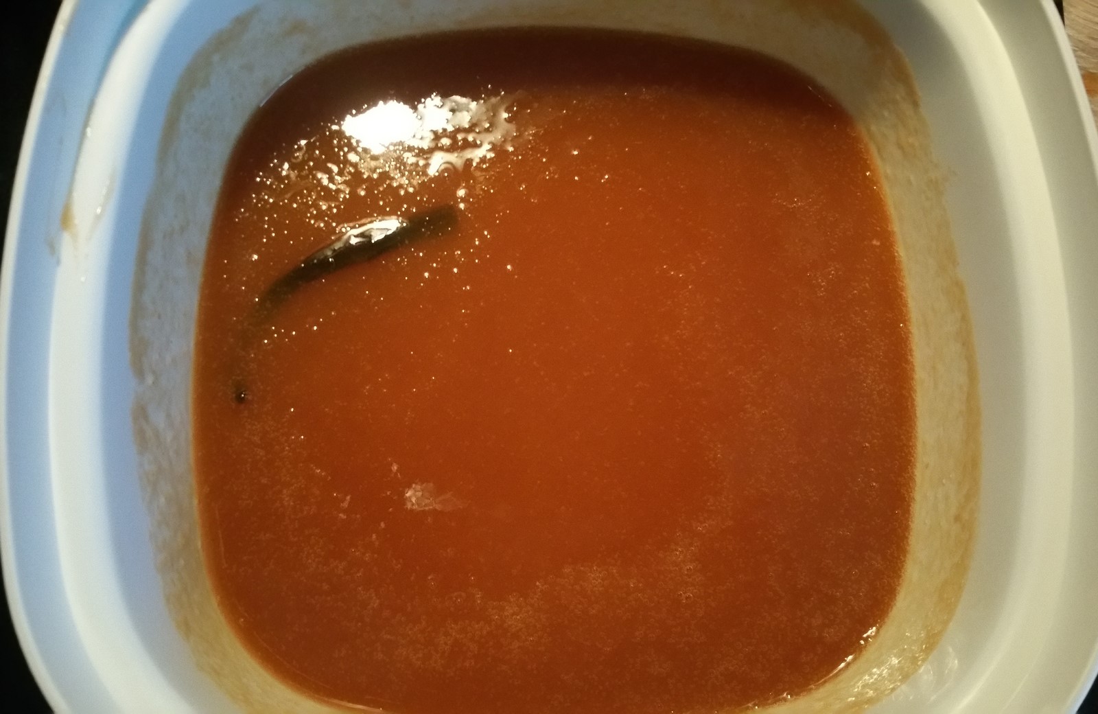 een oud vanille-stokje (leeg dus! Ik bewaar ze altijd in de koelkast wanneer ik ze gebruikt heb. Bij het meekoken komt er nog altijd heel veel smaak vanaf)