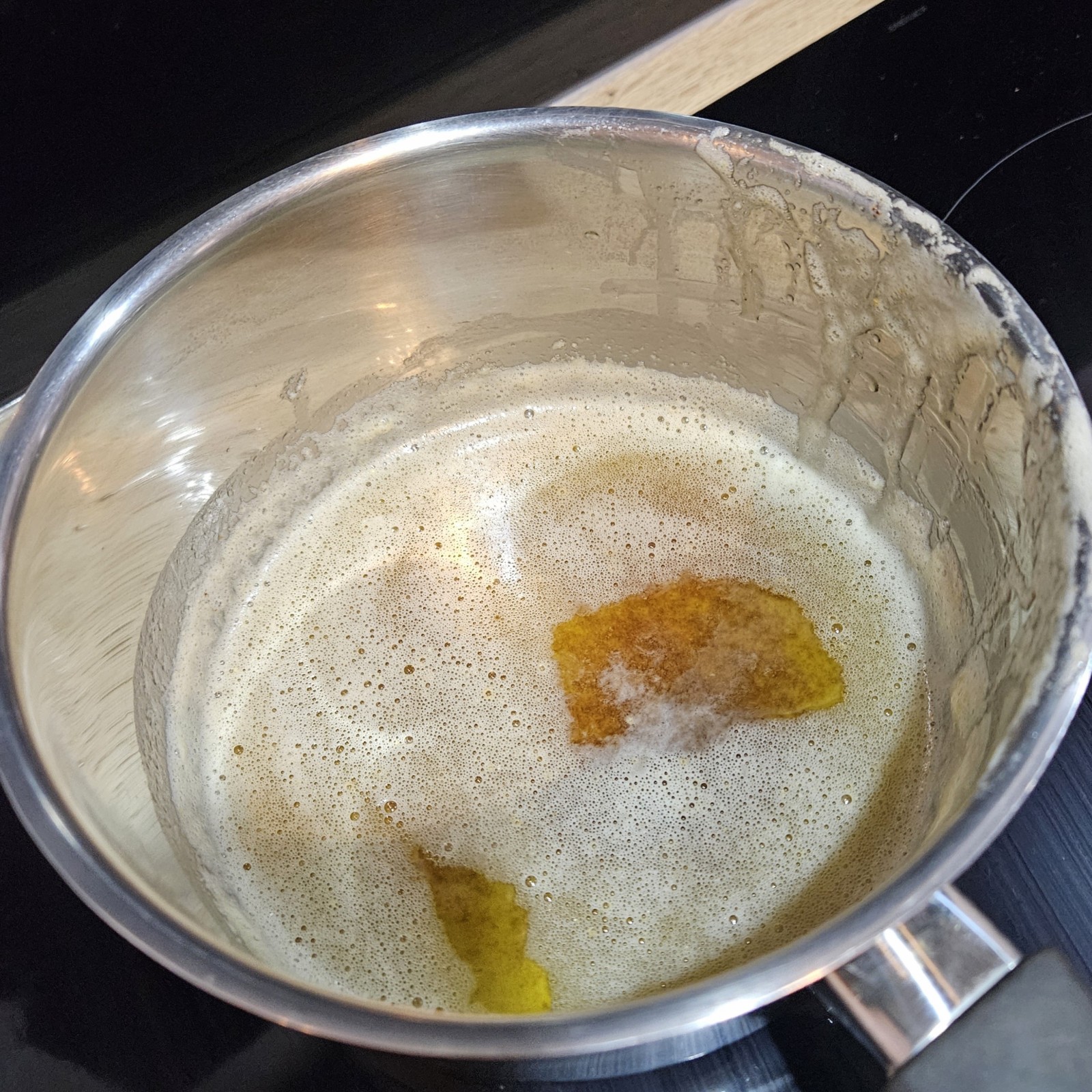 Zodra de beurre noisette klaar is, voeg je deze toe aan de honing zodat het afkoelt. Het moet ongeveer naar 35°C - 40°C.