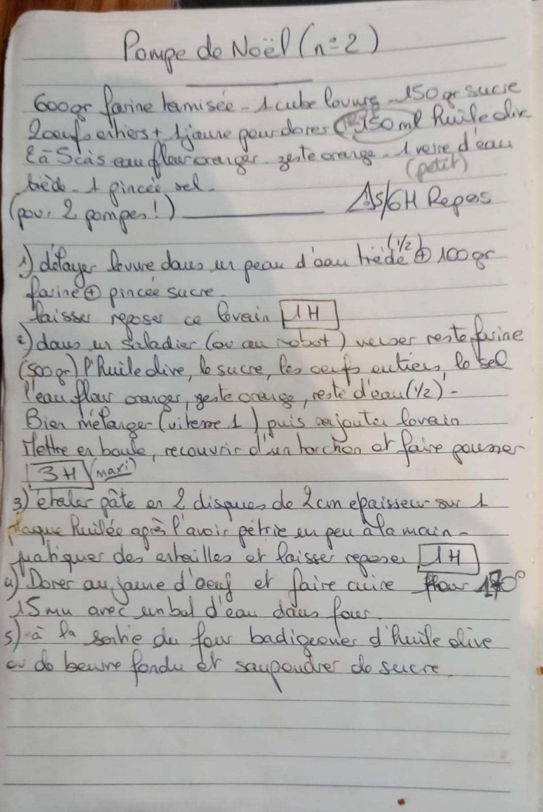 De Pompe of de Fougasse die tijdens het kerstdiner wordt geserveerd is een zoete versie van het oliebrood. Zoals je kunt zien op de foto’s betreft het hier een met de hand geschreven familie-recept en de nicht van mijn man, Sandrine, heeft hem dit jaar gemaakt. Voor 2 broden heb je het volgende nodig: